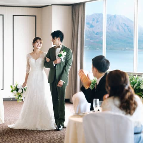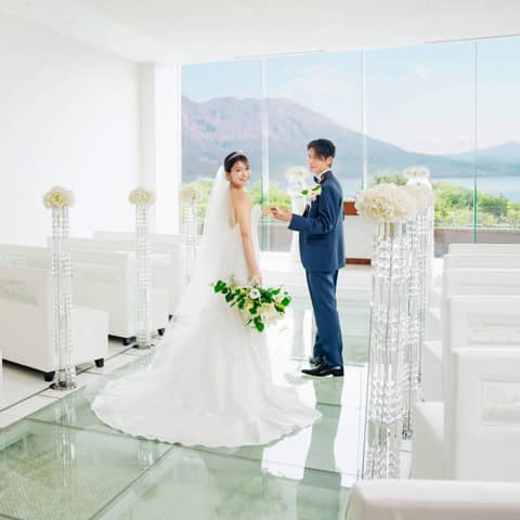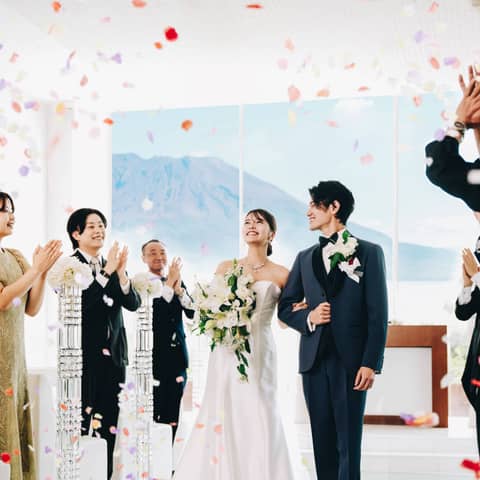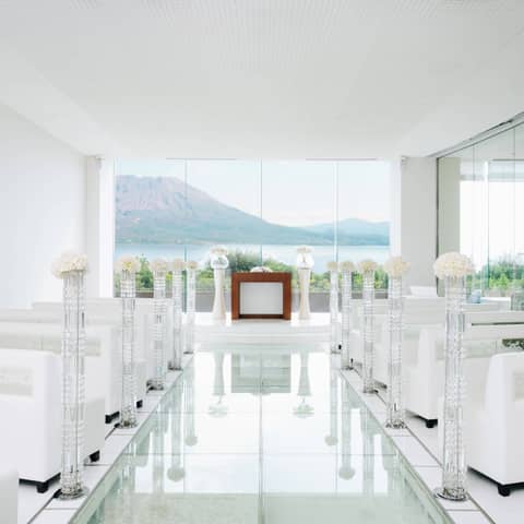 鹿児島のシンボルである桜島と錦江湾を背景に、洗練されたデザインのチャペル。バージンロードには「新しいスタート」を意味する砂浜をイメージした白い砂が敷きつめられ、海辺の挙式を一層深いものにしてくれます。