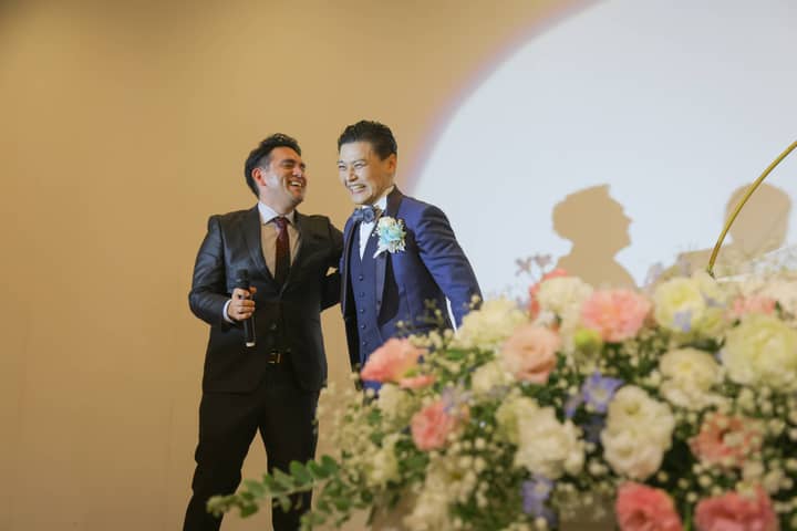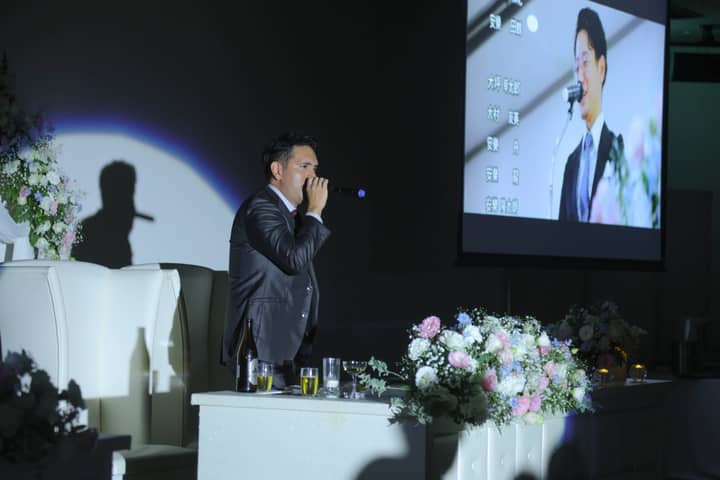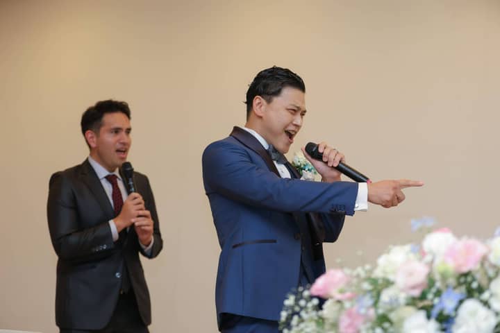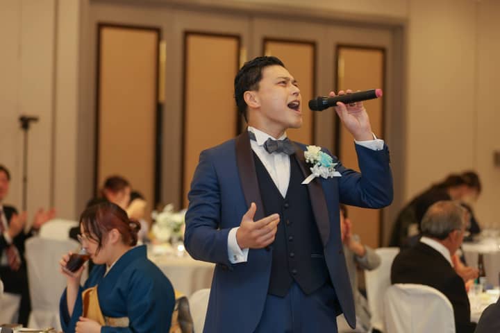 さらに、新郎さまはご友人と一緒にデュエットを披露。軽やかな歌声と楽しい掛け合いに、会場の盛りあがりは最高潮に。ゲストや新婦さまへのファンサービスもたっぷりで、笑顔が絶えない、心弾むひとときとなりました。
