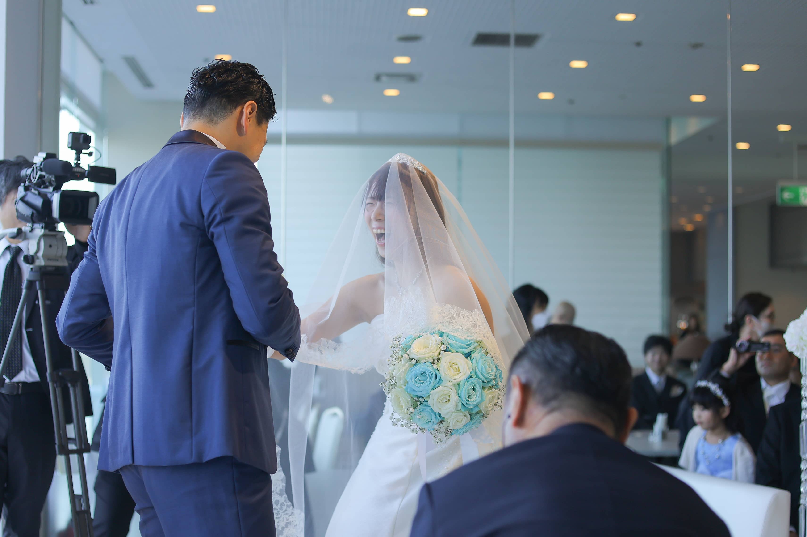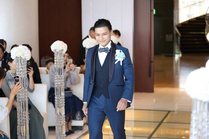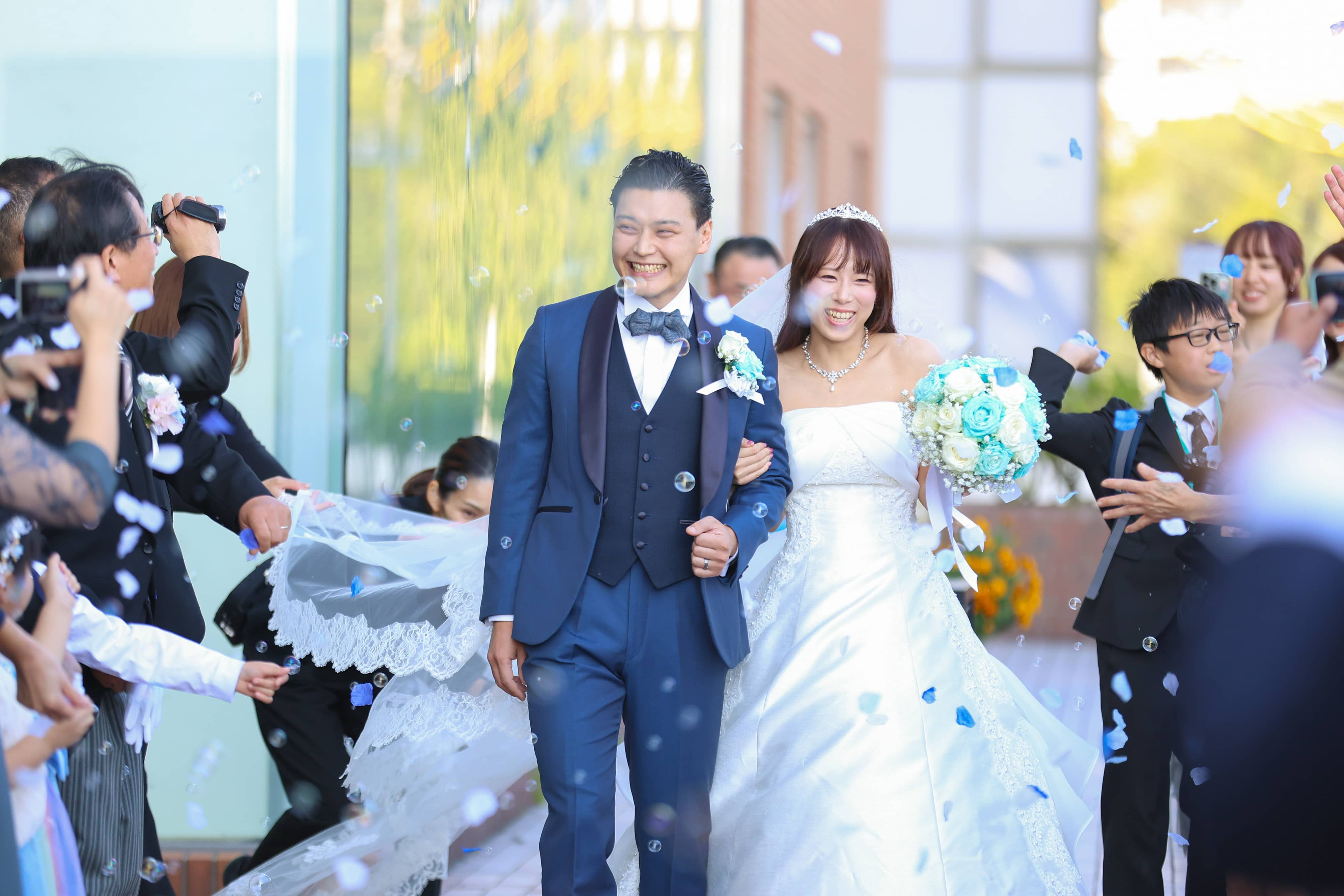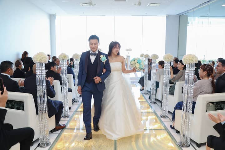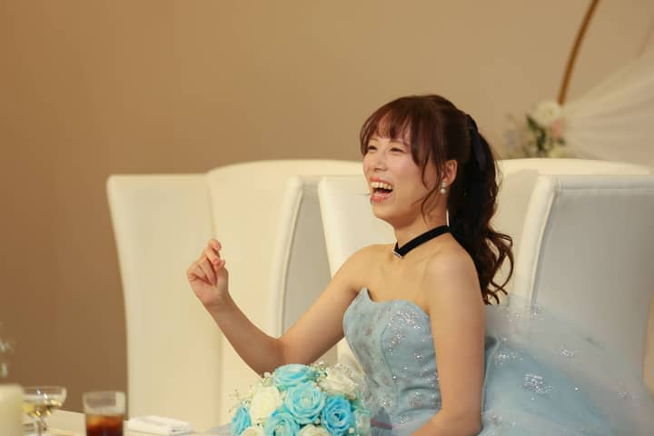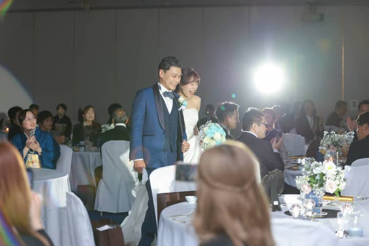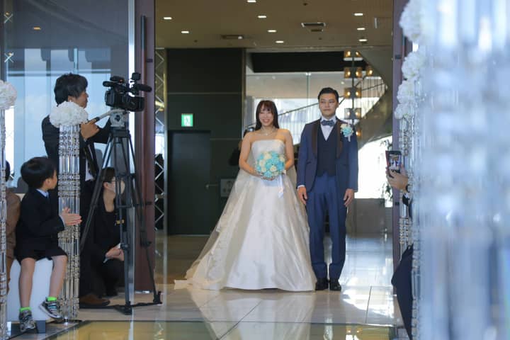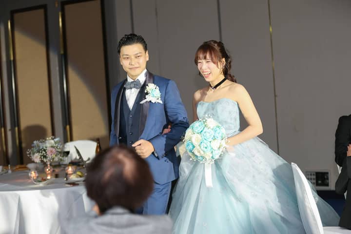 そして、お色直し再入場では、鮮やかなアクアブルーのドレスに身を包んだ新婦さまが登場。先ほどまでの雰囲気をがらりと変えた、爽やかで華やかな入場にゲストから思わず歓声があがります。