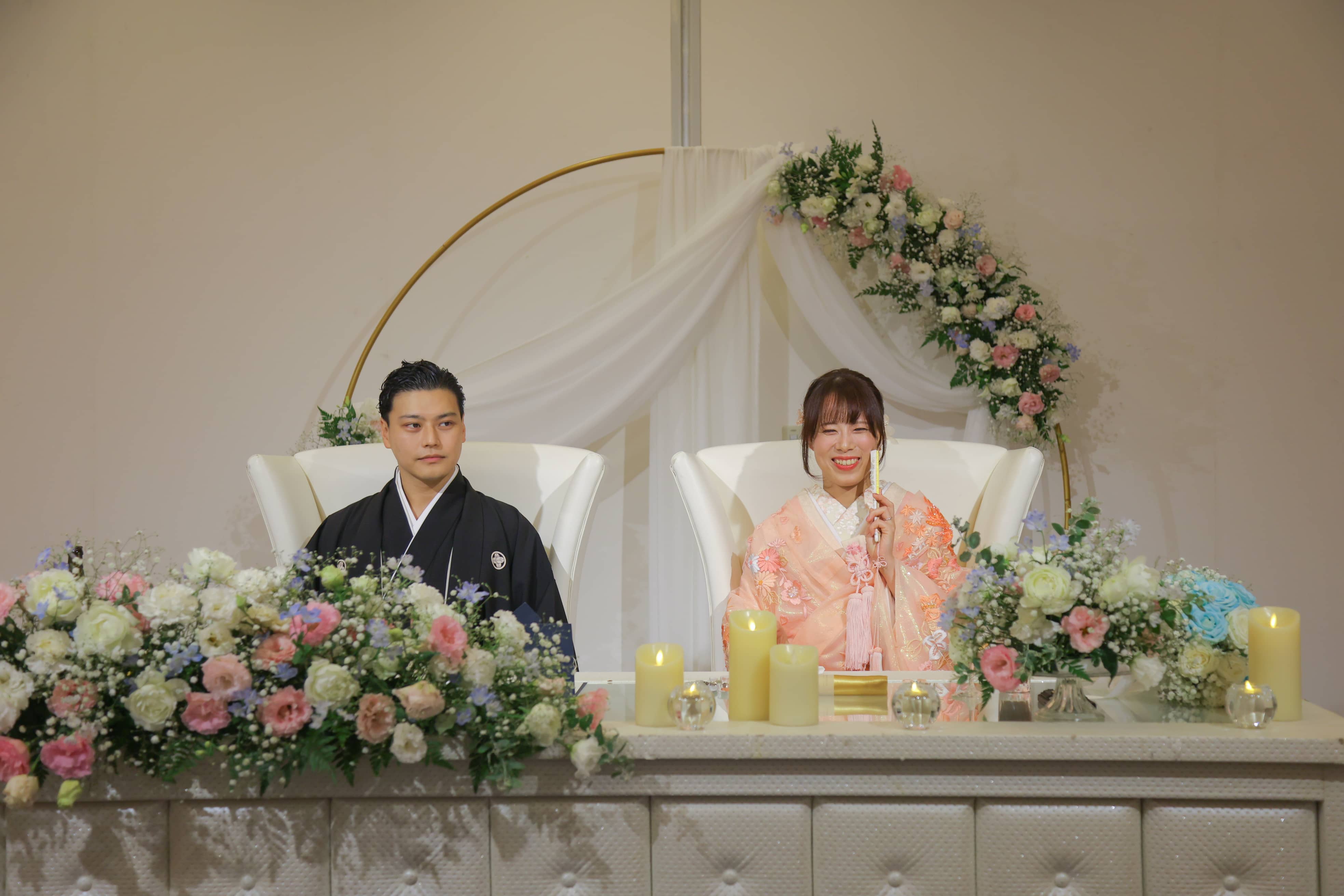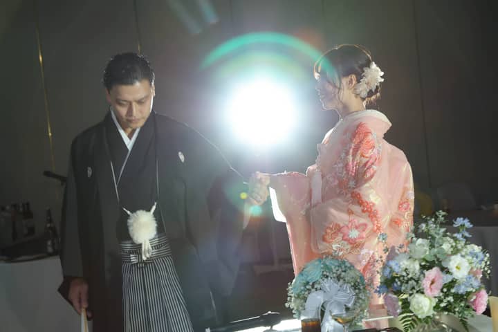 2回目のお色直しでは、新婦さまは鮮やかなピンクの色打掛、新郎さまは黒の紋付袴に身を包み、和の装いで再入場。華やかで凛とした姿に、会場から思わずため息がこぼれます。