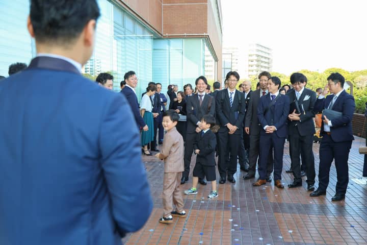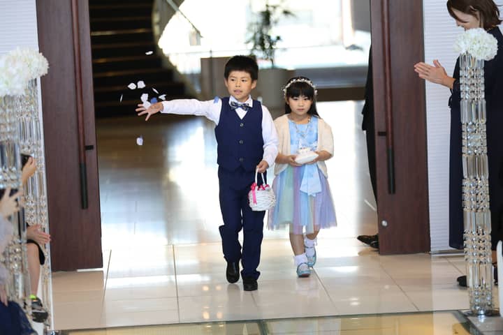 ゲストに見守られながら、新郎さまがゆっくりとチャペルへ入場。続いて登場したフラワーボーイ&ガールが、会場に可愛らしい笑顔を届け、その場の空気が一気にあたたかく和みます。