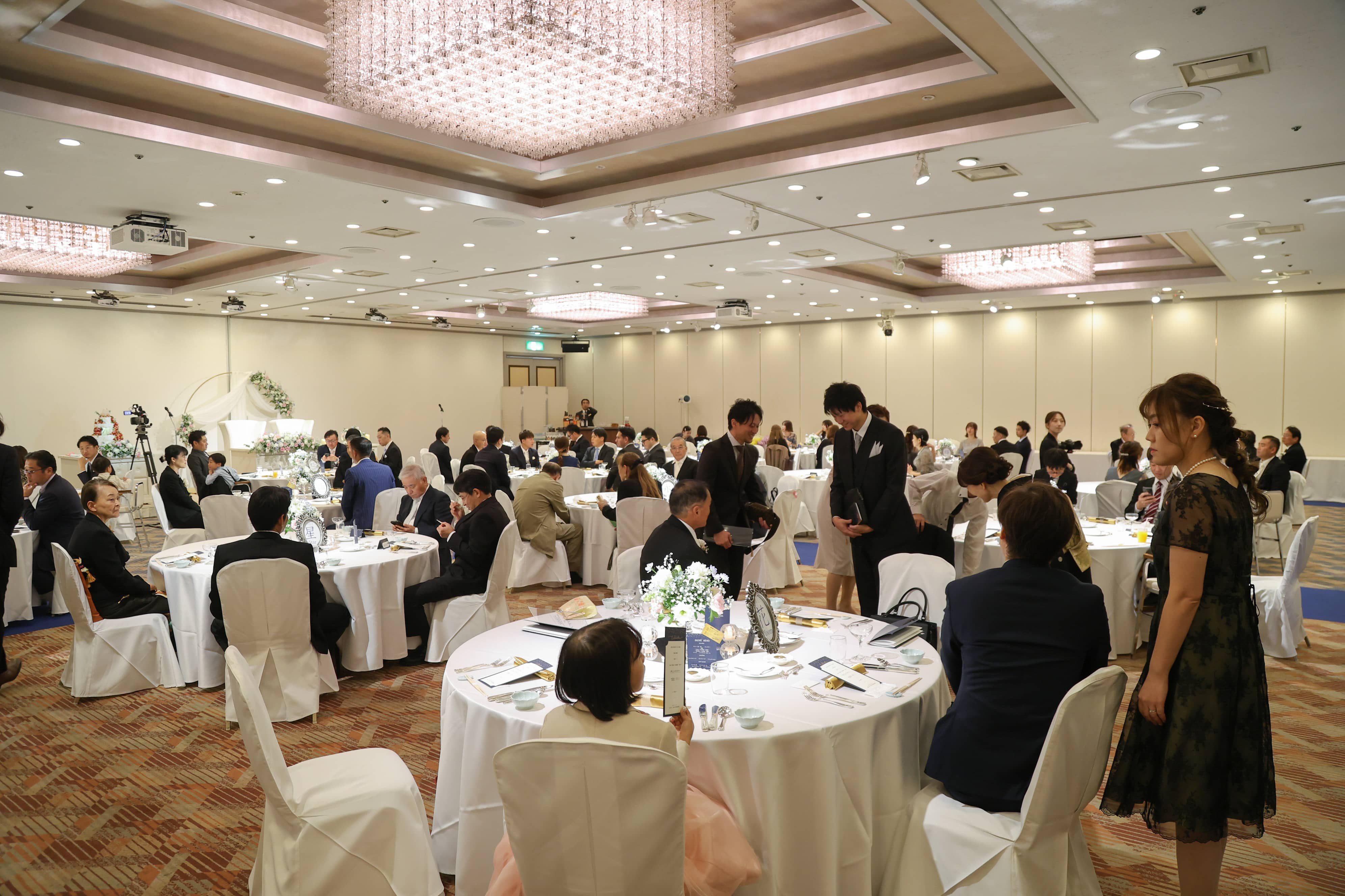 披露宴の開宴を前に、会場内はすでに賑やかな笑顔でいっぱい。ゲストの期待が高まる中、おふたりがゆっくりと入場します。