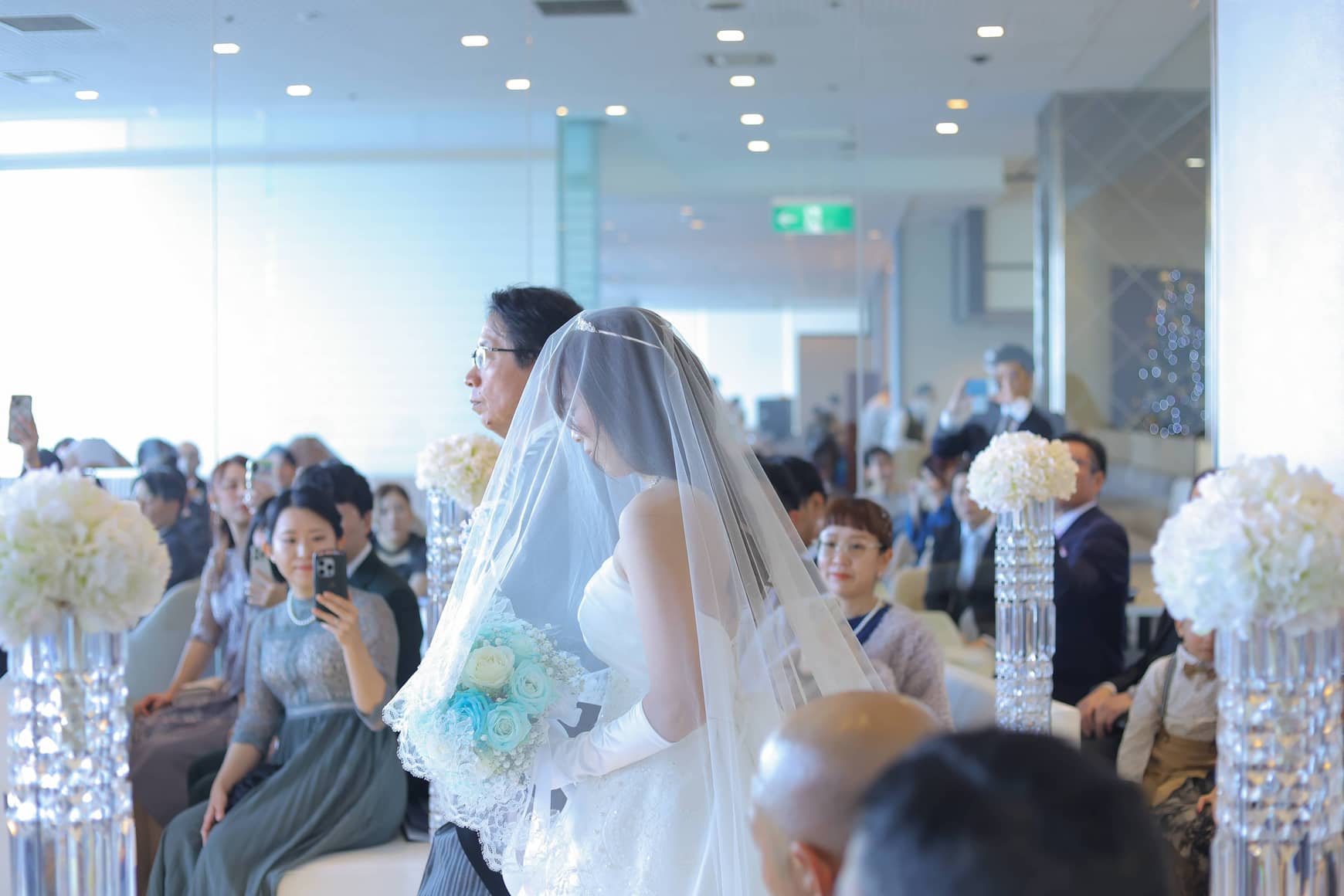 そして、新婦さまの入場。自然光が差し込むバージンロードを、一歩一歩ゆっくりと進む姿は、まるで光に導かれているかのような美しさ。